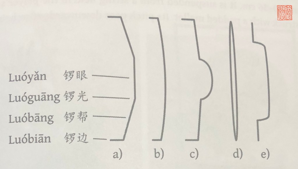 a) Gongs con una superficie en ángulo. Sus partes se nombran de la siguiente manera: Luóyǎn: El centro plano. Luóguāng: el anillo ligeramente angulado entre el centro plano y la porción inclinada. Luóbāng: la porción inclinada. Luóbiān: el borde.