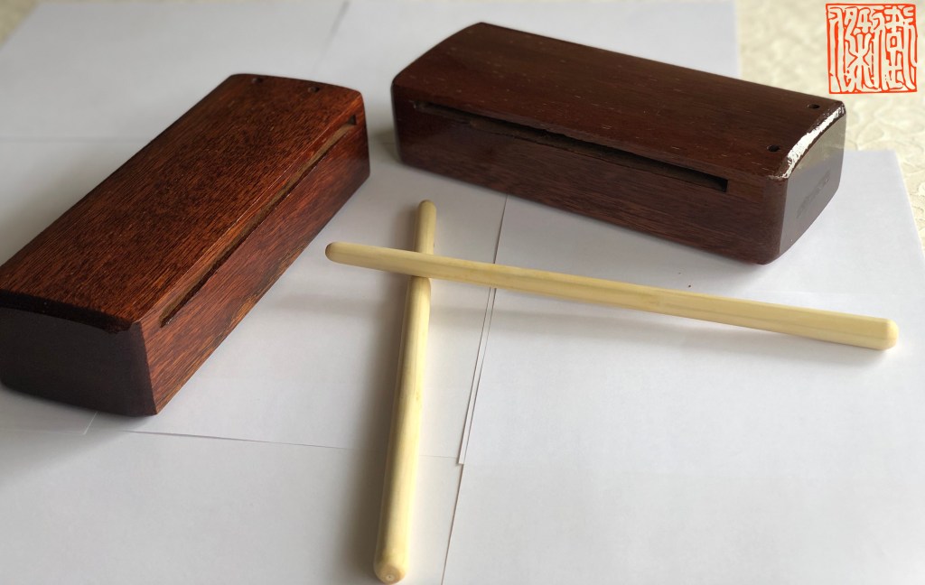 El Muyu 木鱼 (pez de madera) a menudo se conoce como “Bloque de Templo, ya que los budistas lo usan tradicionalmente para mantener el ritmo mientras cantan sutras. Es una pieza de madera hueca en forma de bulbo, golpeada con un mazo para producir un sonido «tock». Se pueden montar múltiples Muyu (generalmente de dos a cinco) en un estante para producir diferentes tonos. El músico puede especificar cuántos tonos se requieren.