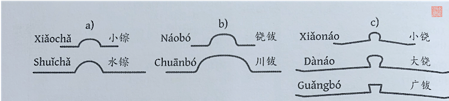 Los Gongs chinos vienen en cinco formas generales. sus secciones transversales se ilustran en el siguiente diagrama: