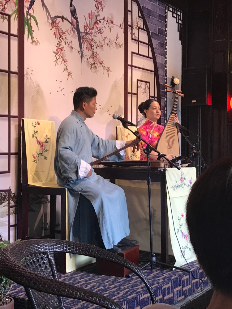 En Suzhou, muy cerca de Shanghai, encontré mientras recorría sin mi grupo de tour; – qué desordenado fui!!- con una casa que tenía este letrero y es un local donde sirven en especial té y ofrecen música en vivo. En esta pareja ella cantaba y tocaba pipa «琵琶», y él sólo tocaba el sanxian «三弦».-